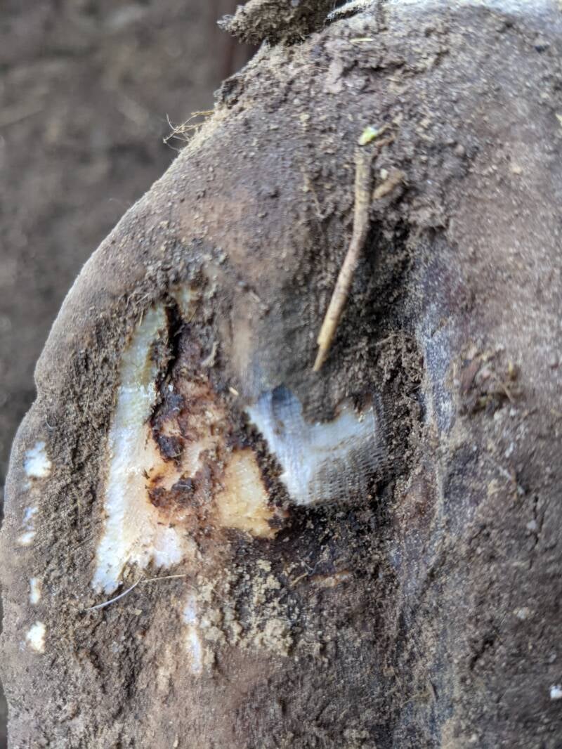 Manchmal kommen kleinere Hufgeschwüre oder beginnende Fäulnisherde bei der Bearbeitung zu Tage. Der Hufbearbeiter entfernt soweit es geht (so viel wie möglich, so wenig wie nötig) das Horn um das Fortschreiten zu unterbrechen. Besonders häufig findet man solche Stellen unter umlegende Eckstreben wieder, was zeigt, wie wichtig die regelmäßige Kürzung dieser ist.